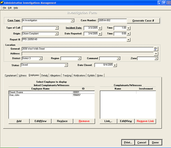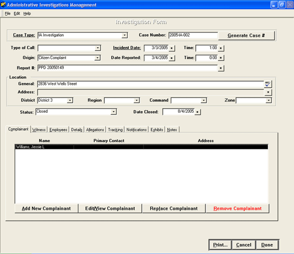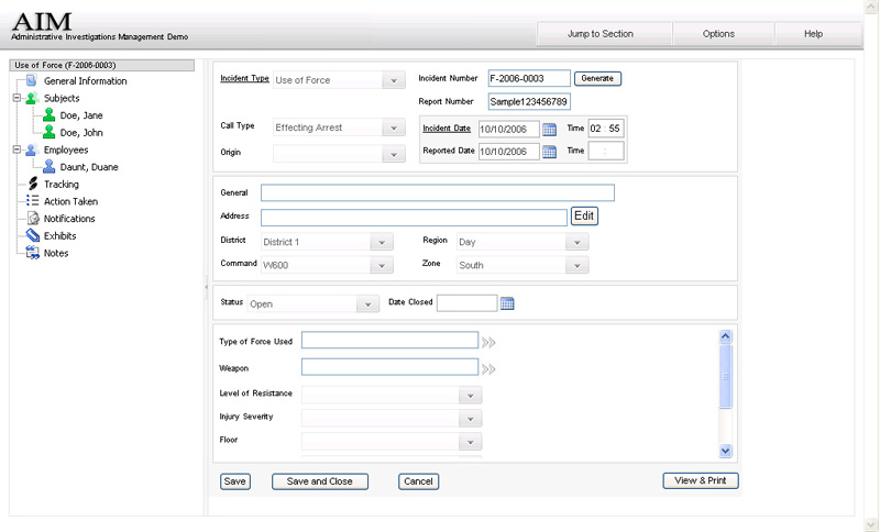 The Administrative Investigations Management system, AIM, provides agencies with a dynamic tool to collect, manage, track, analyze and report on a wide range of data including Internal Affairs, Use of Force, Pursuits, Accidents, Awards, Time/Attendance and other data related to employee professionalism, performance and productivity.